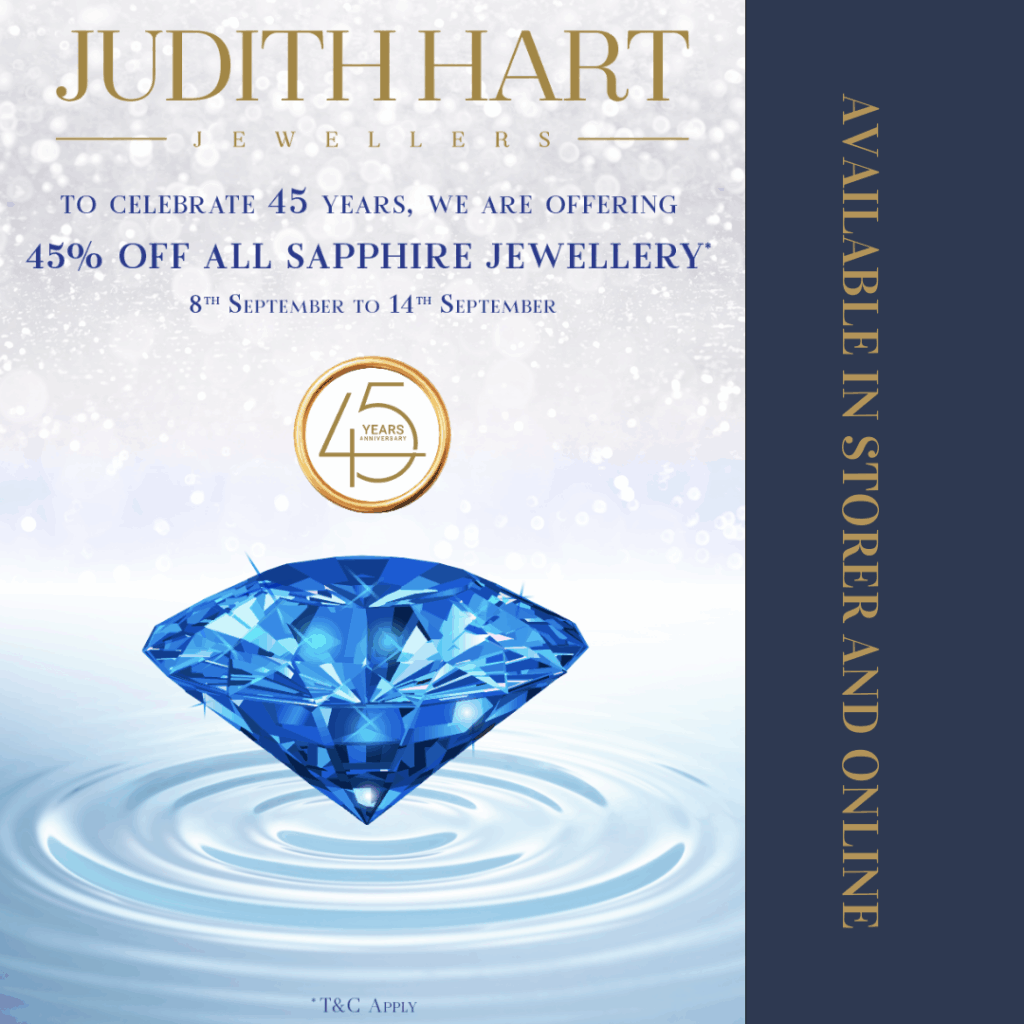 To mark 45 years of timeless elegance, Judith Hart Jewellers are offering an exclusive 45% off all sapphire jewellery. From classic designs to contemporary styles, it’s the perfect time to add a touch of luxury to your collection.