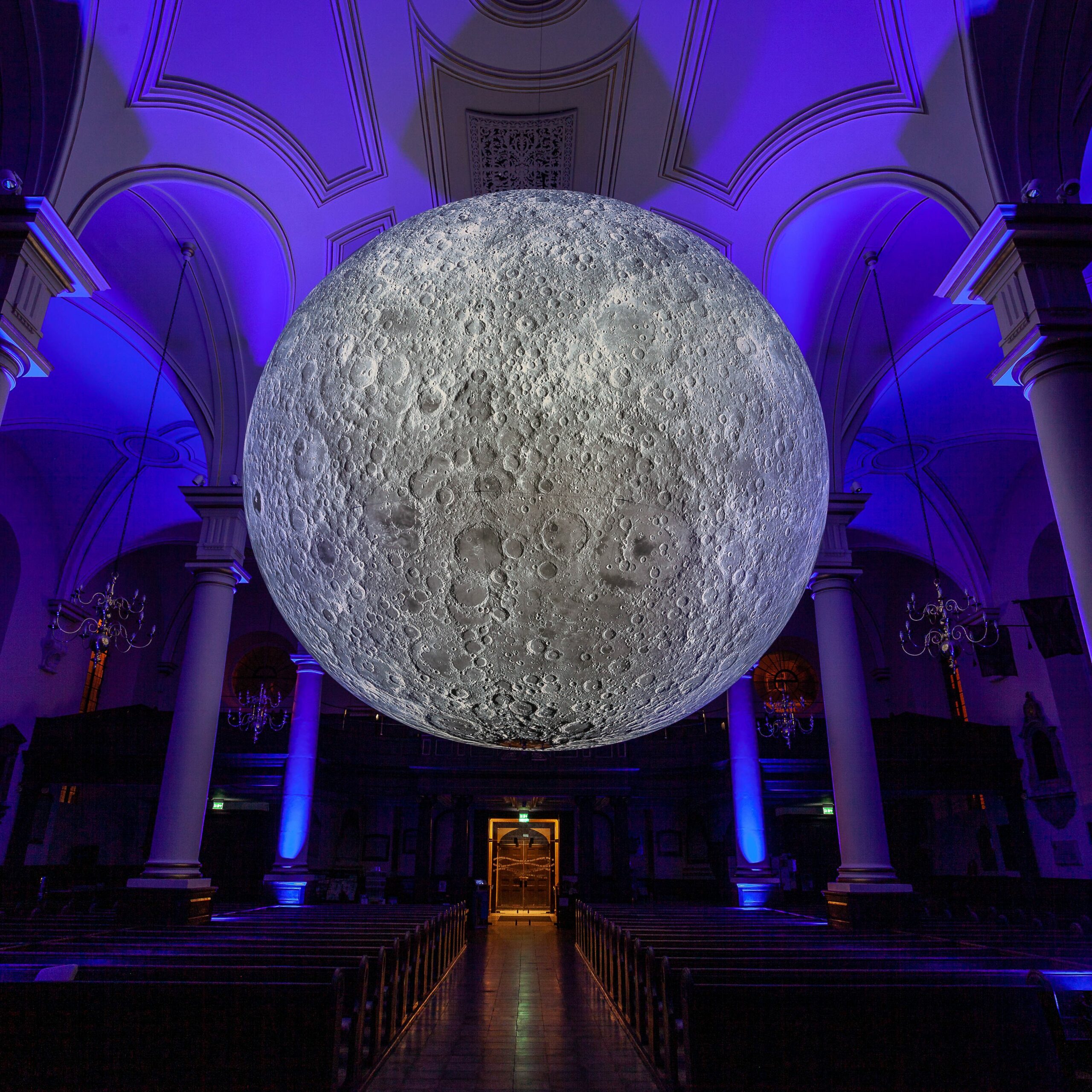Measuring seven metres in diameter, Museum of the Moon is a touring artwork featuring detailed NASA imagery of the lunar surface. At an approximate scale of 1:500,000, each centimetre of the internally lit spherical sculpture represents 5km of the moon’s surface. The installation is a fusion of lunar imagery, moonlight and surround sound composition created by BAFTA and award winning composer Dan Jones.