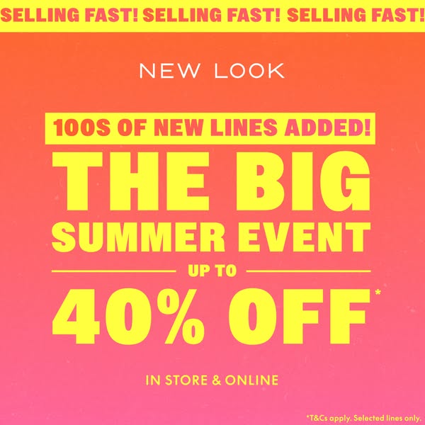 Hurry, 40% off at New Look is really hotting up in the Big Summer Event. T&Cs apply. Selected lines only.