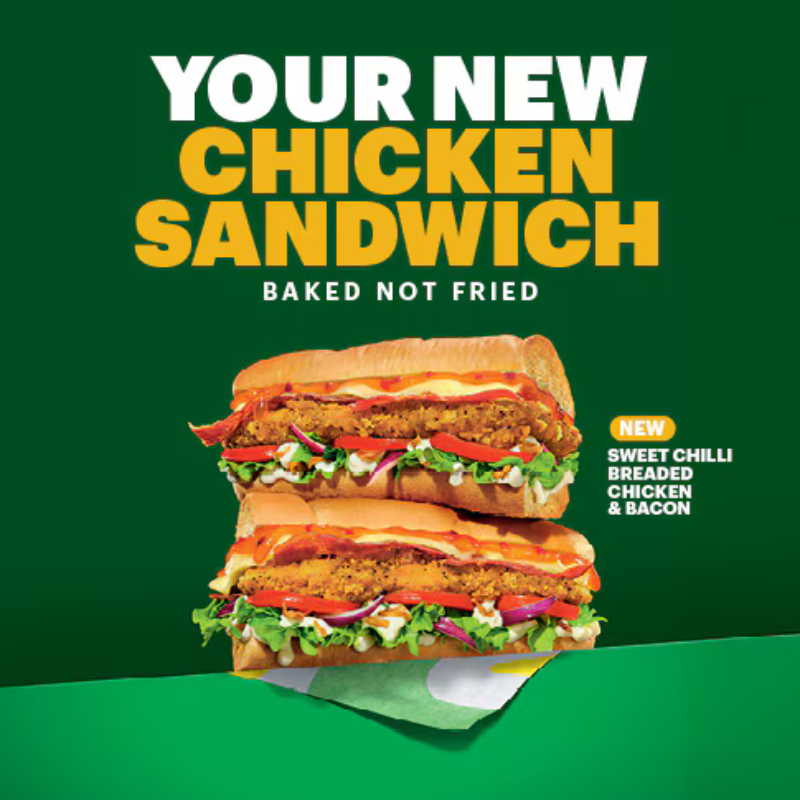 The new Subway sweet chilli breaded chicken & bacon sandwich is available now at subway stores UK wide!