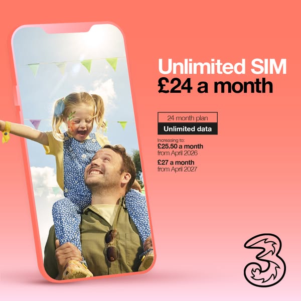 Unlimited SIM from £24 a month, then £25.50 from April 2026 and £27 from April 2027. Get yours on Three now.